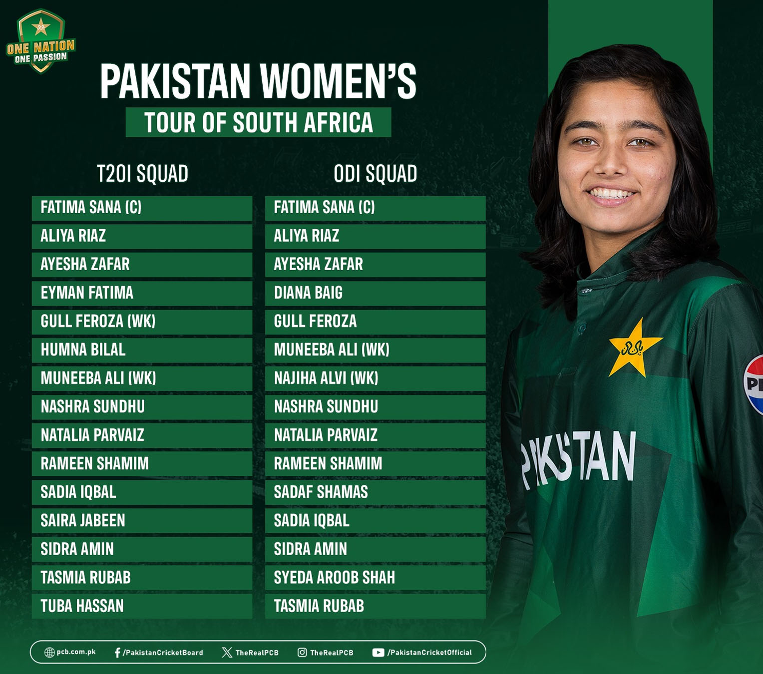 پاکستان کرکٹ بورڈ نے ساؤتھ افریقہ کے خلاف ون ڈے اور ٹی ٹوئنٹی سیریز کے لیے خواتین کی قومی اسکواڈز کا اعلان کردیا ہے، فاطمہ ثنا ٹیم کی کپتانی کریں گی۔