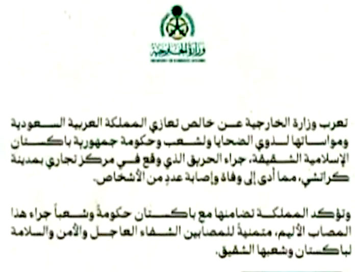 سعودی وزارت خارجہ نے کراچی کے گل پلازہ میں آتشزدگی کے واقعے میں اموات پر گہرے دکھ اور افسوس کا اظہار کیا ہے۔