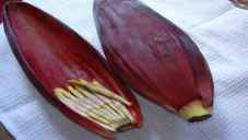 Banana flower Also Known asKele ka phool, Banana Blossom, Ngapyaw phoo, Puso, Kehel Mal..A large, purplish blossom that grows from the end of a bunch of bananas. The leaves enclose scented flowers. The outer leaves are much darker and tougher compared to the tender inner leaves which are used in cooking. It is treated as a vegetable in several tropical and Asian cuisines. Do note that the cut ends of banana flower oozes a sap which is sticky and stains the hands and clothes if precaution is not taken. Thus, it is better to rub your hands with oil before cutting banana flower. The tough outer leaves which are called bracts are first removed and then the remaining flower can be steamed whole till tender or for around 15 minutes. Allow to cool and then chop or slice as required. In case you don't steam the banana flower, chop the banana flowers and soak in buttermilk till use. Buttermilk prevents excess sap from sticking and avoids the flowers from turning black.